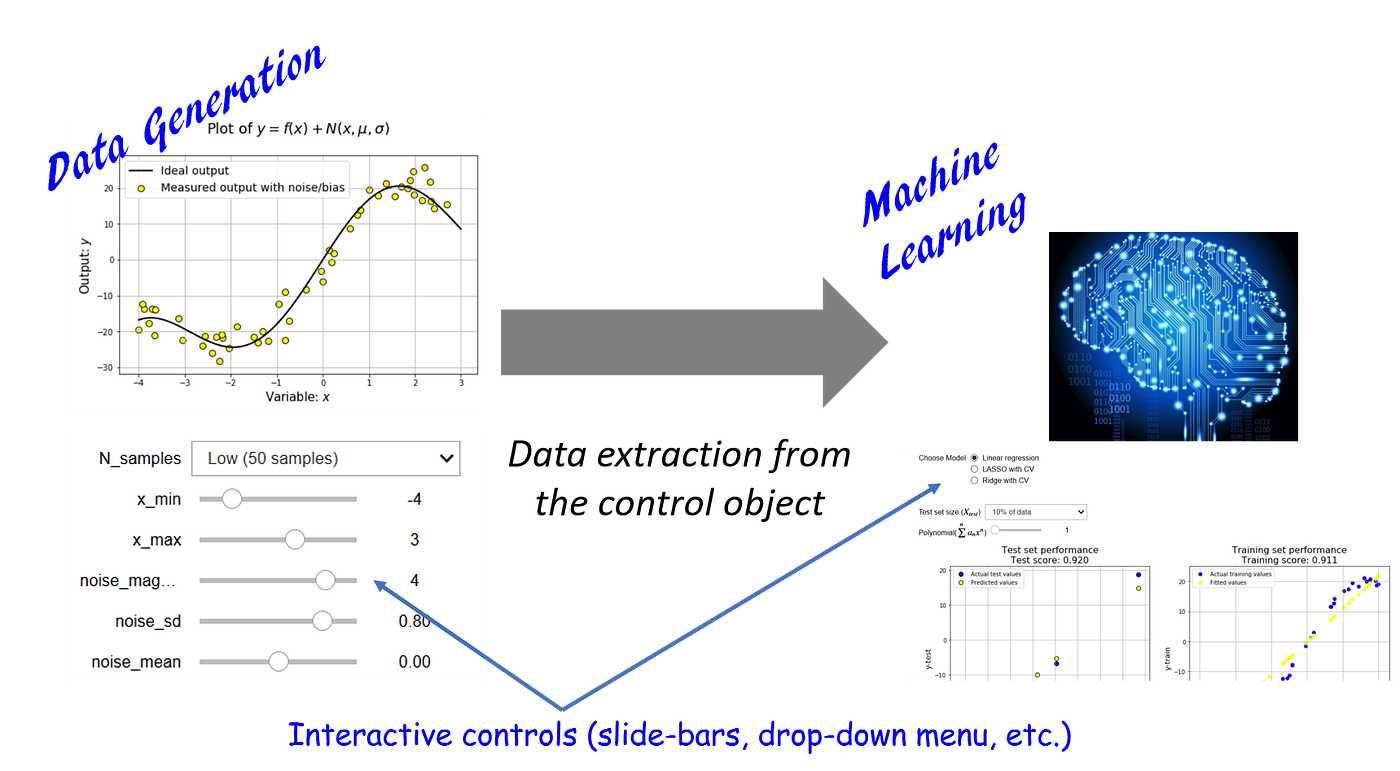 The boiler plate lawmaking is available in my Github repository. We show the interactivity in 2 stages. Outset, we show the data generation procedure as a function of input variables and statistical backdrop of the associated noise. Here is a video of the process where user can dynamically generate and plot the nonlinear function using elementary slide-bar controls.